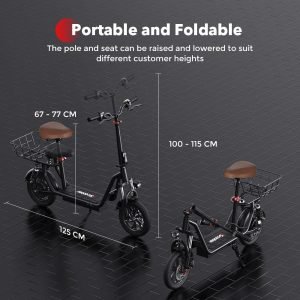 Le design ergonomique intègre un siège ajustable et confortable, idéal pour les trajets prolongés, ainsi qu’un panier pratique pour transporter des objets. Malgré ses nombreux équipements, la i12 reste légère avec un poids de 20 kg, ce qui facilite sa maniabilité.